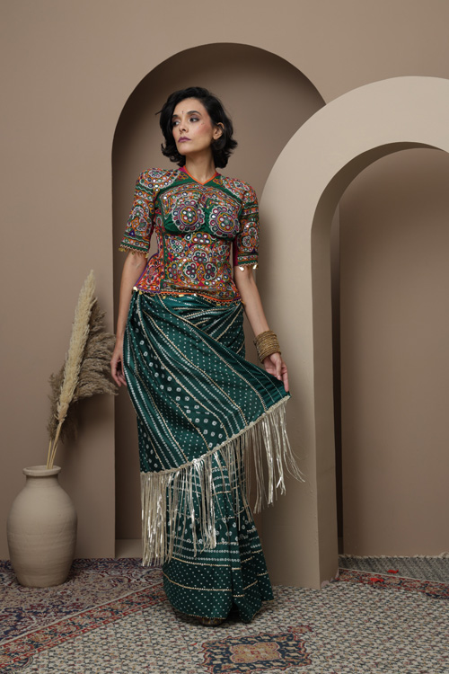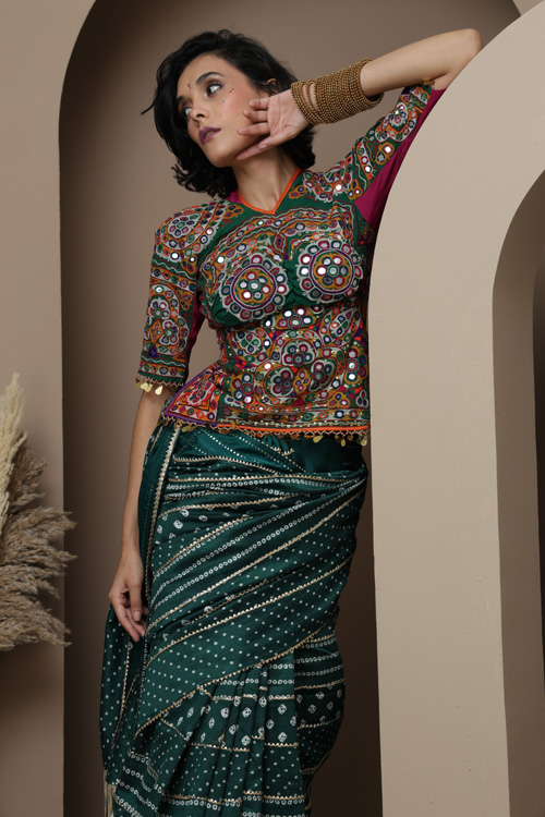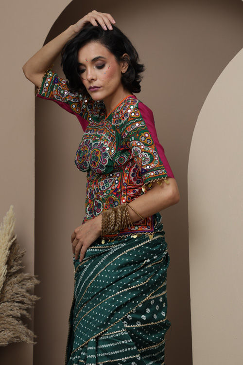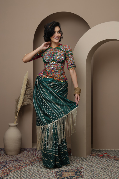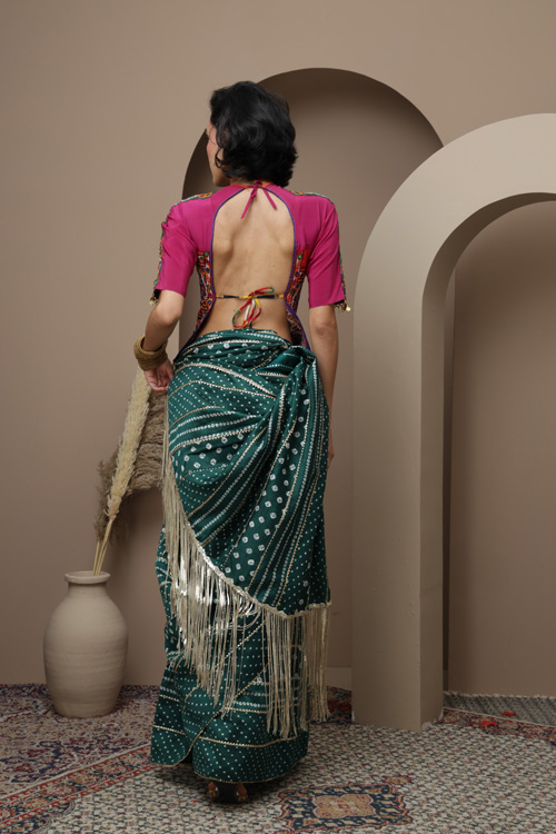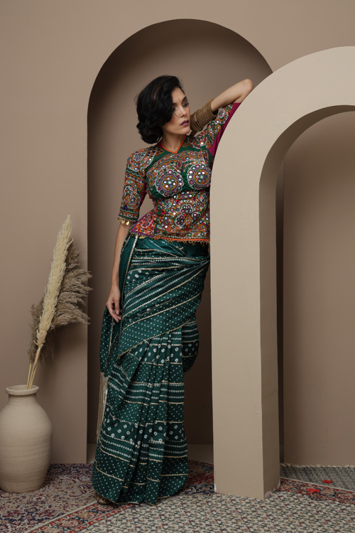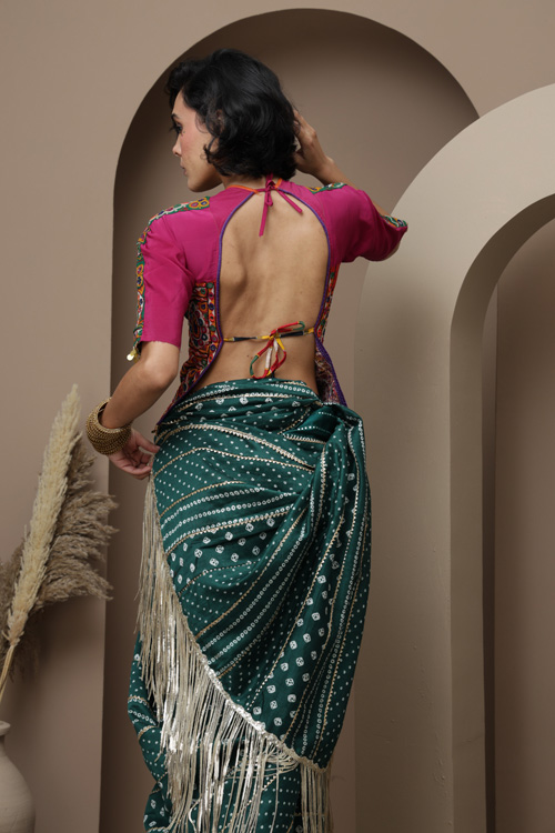This saree features the classic Bandhani an ancient tie-dye technique know for its intricate and symmetrical patter.