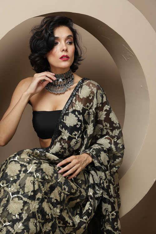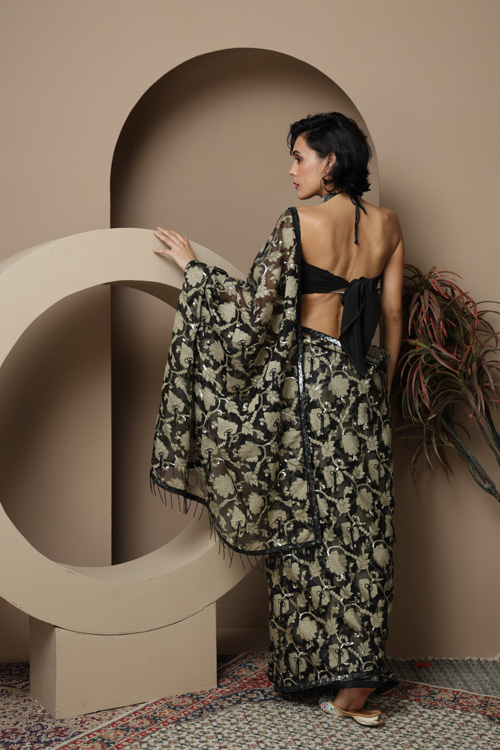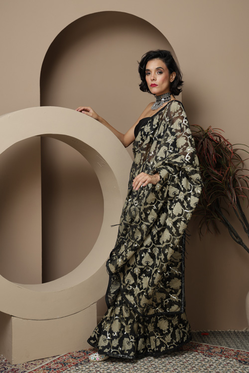 Black Soft organza embroidered saree.