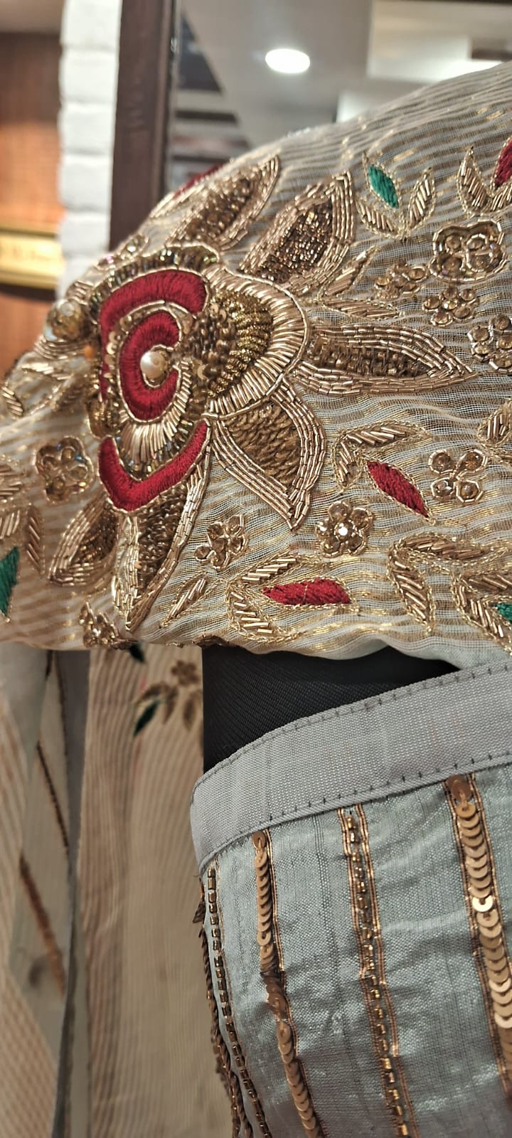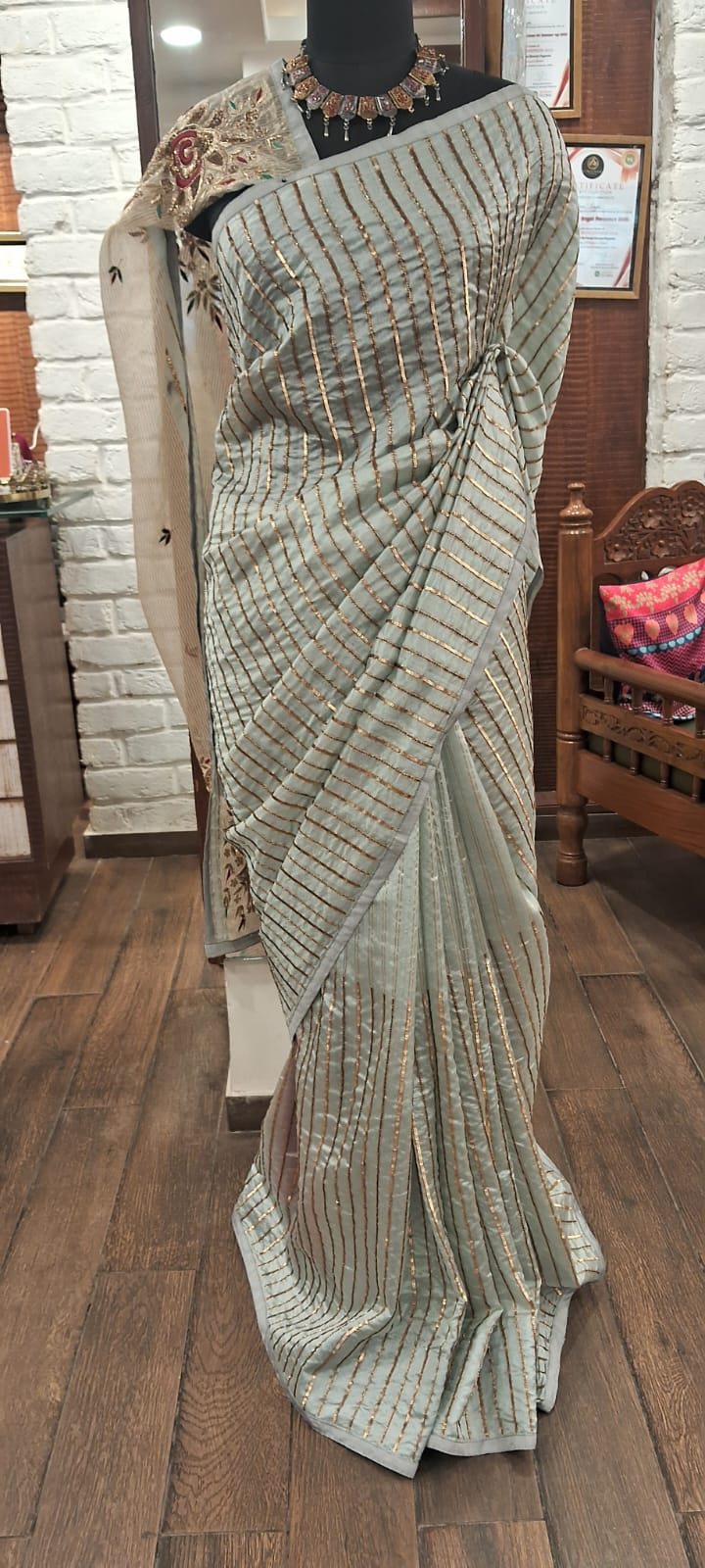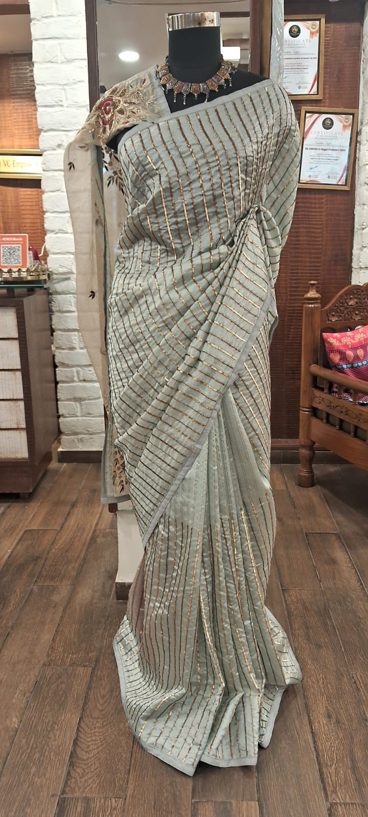 Product details – chanderi silk saree with blouse fabric Care instructions – dry cleaning only Know your Product- chanderi silk saree with zardozi and cutdana hand work embroidered blouse fabric Country origin – India Colour – smoke