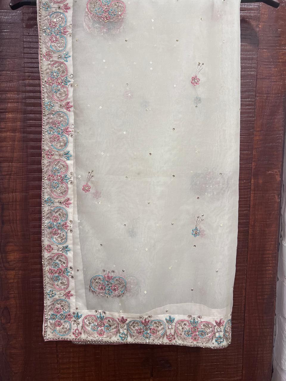 Indulge in the ethereal beauty of our white hand work pure organza dupatta symbol of timeless elegance and sophistication.