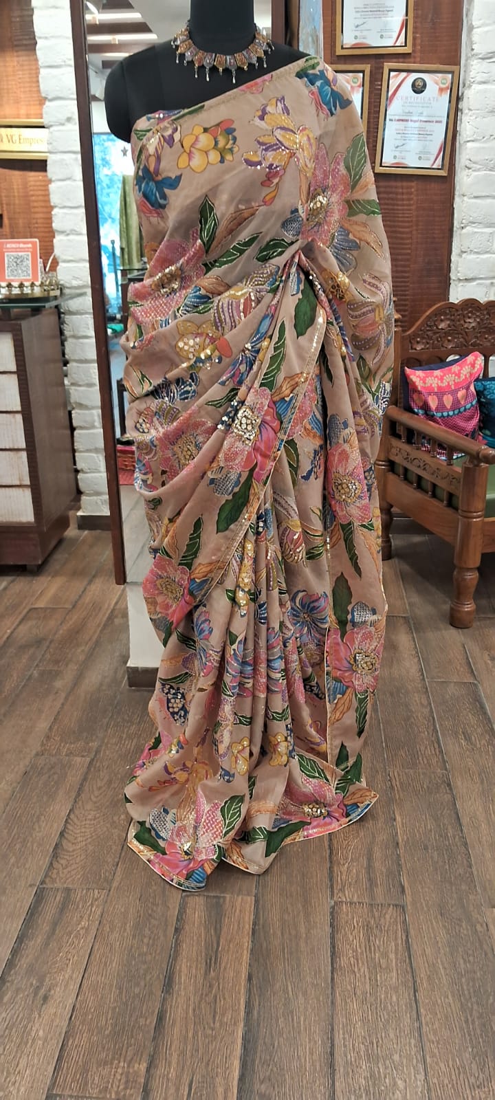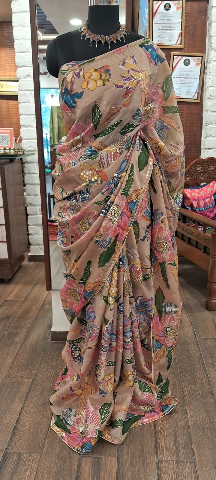 Product details – printed organza with blouse fabric Care instructions – dry cleaning only Know your Product – printed organza with highlights and sequence same printed blouse Country origin- India Colour- beige