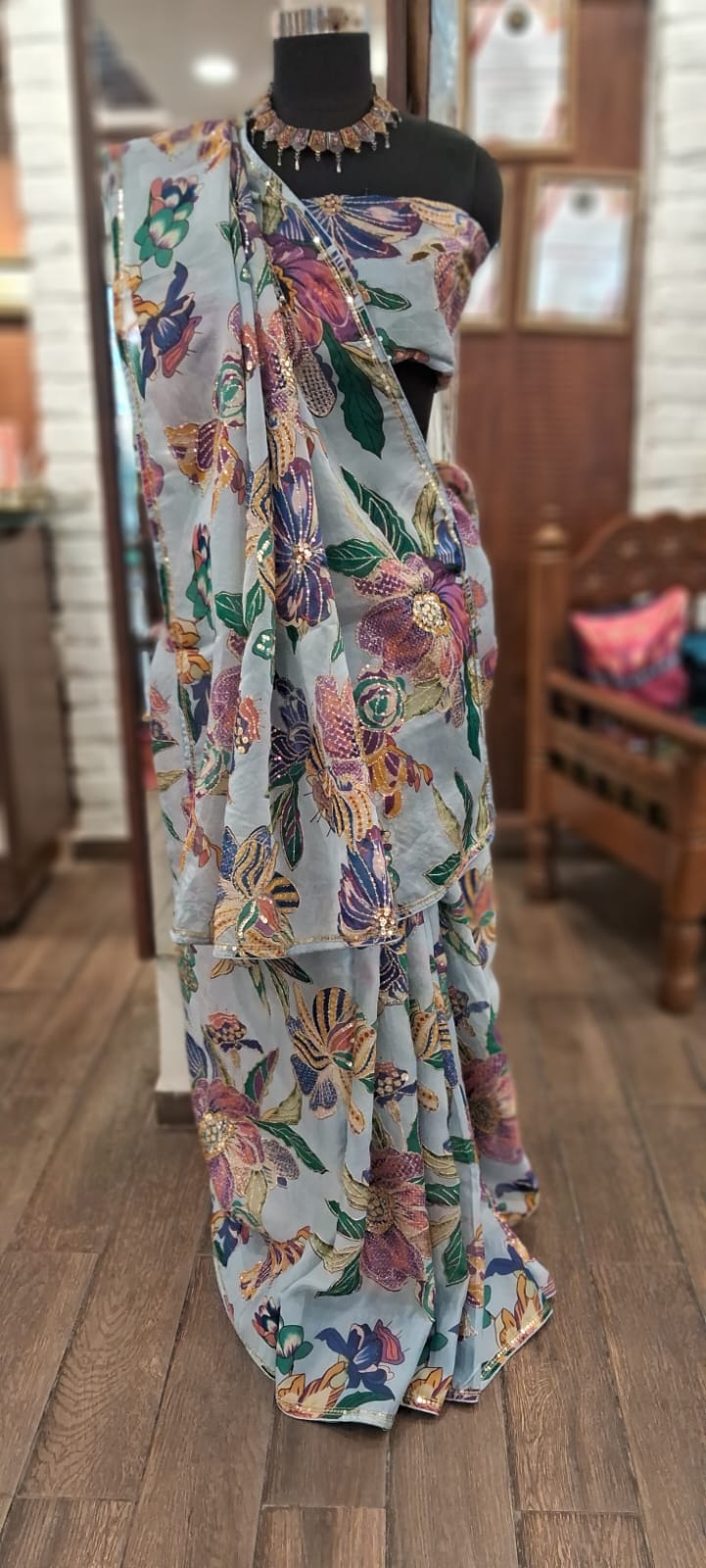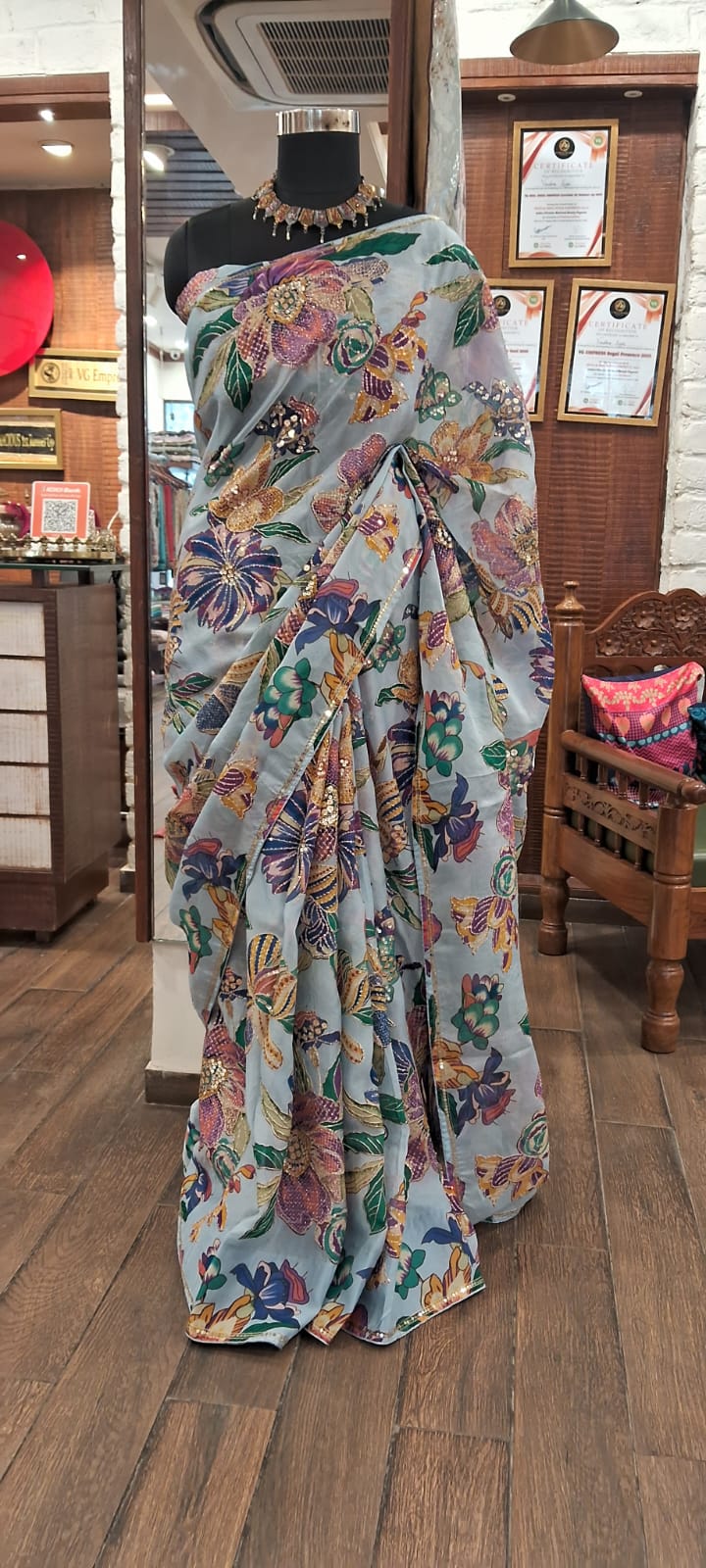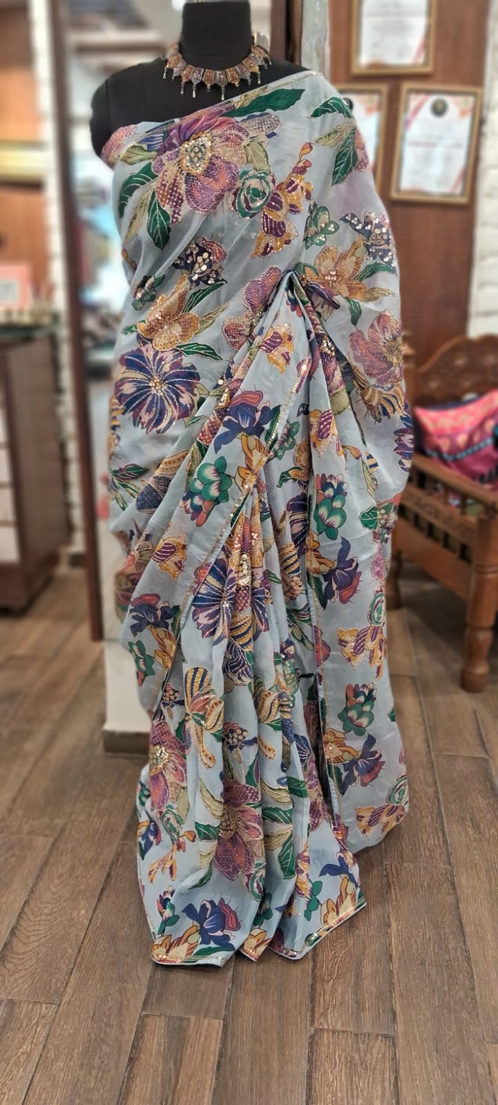 Know your Product – printed organza with highlights and sequence same printed blouse