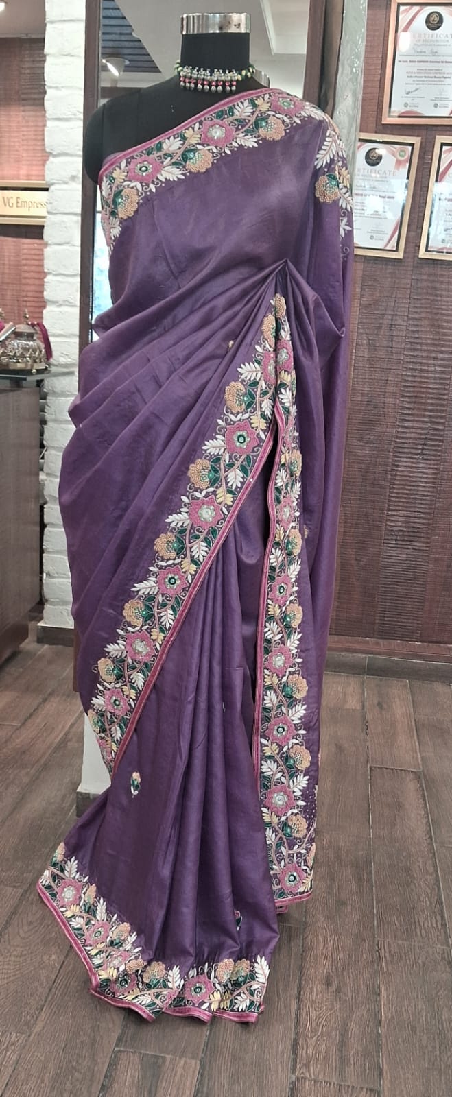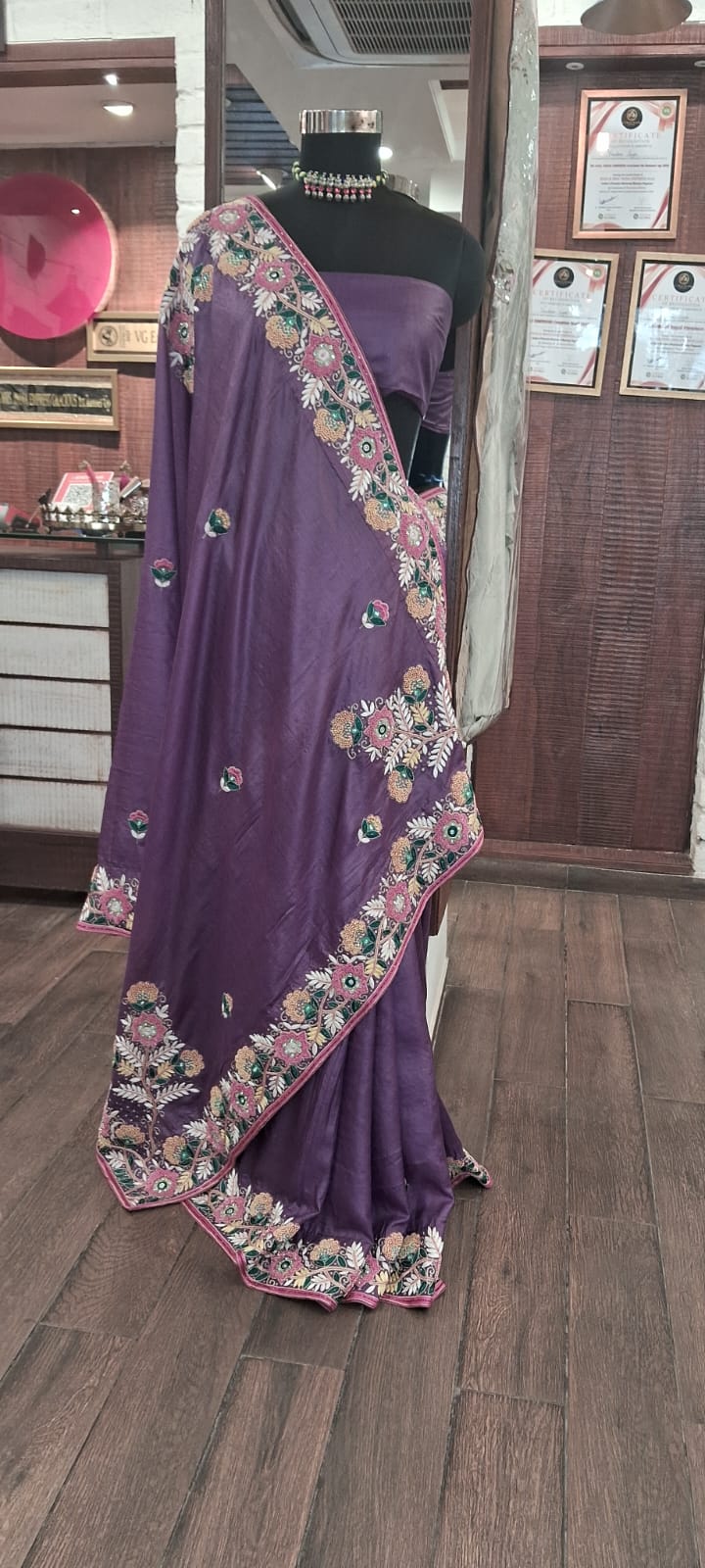 Product details – silk saree hand work with blouse fabric Care instructions – dry cleaning only Know your Product – silk saree with zardozi and sequence work Country origin – India Colour – purple