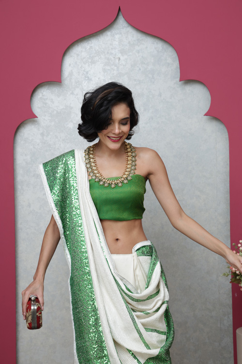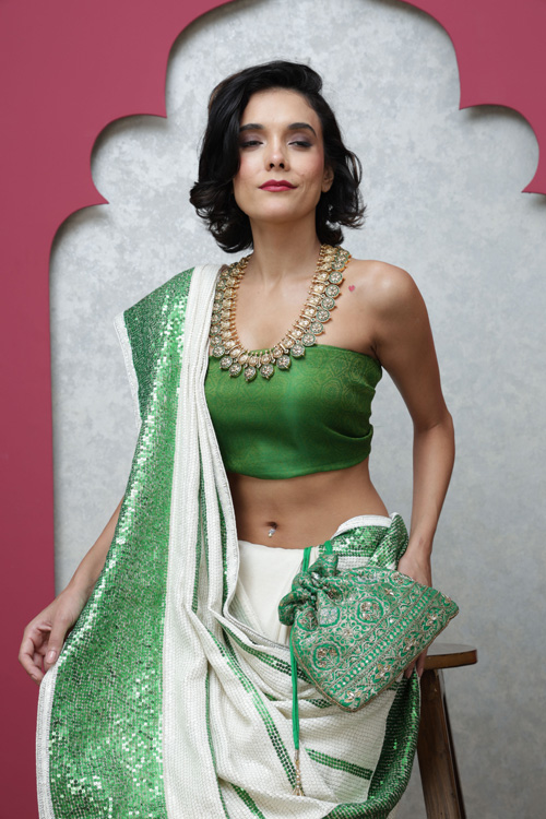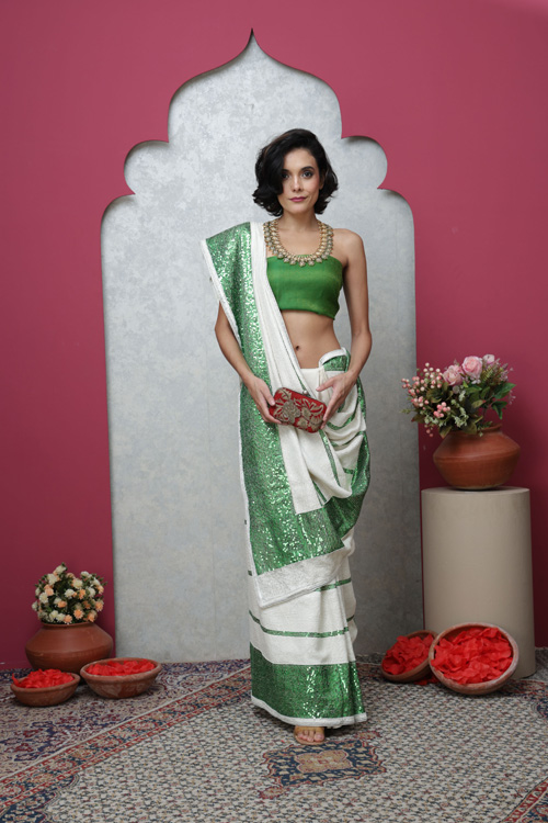 Look your best with this beautiful saree made by Vandana, made male with the finest material it is designed to perfection it comes with an unstitched blouse