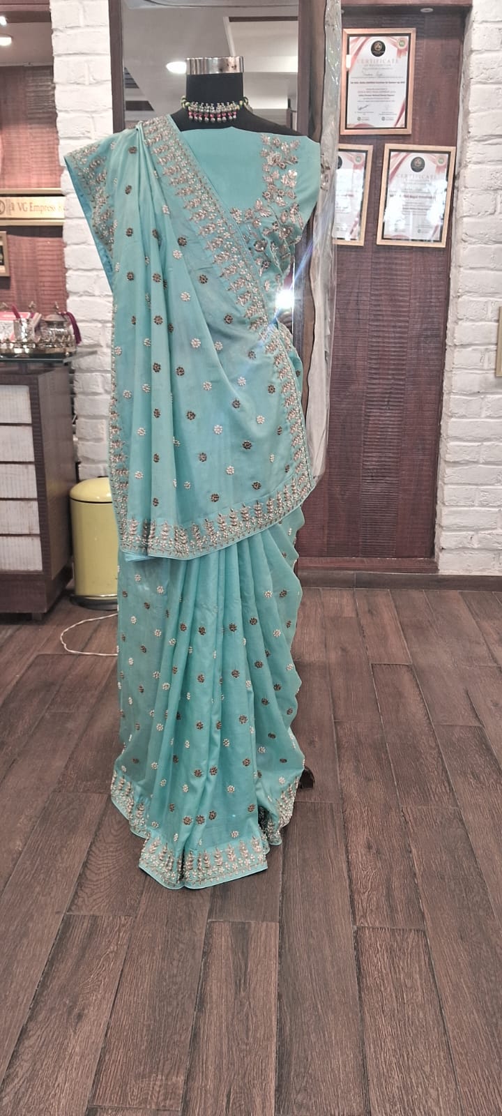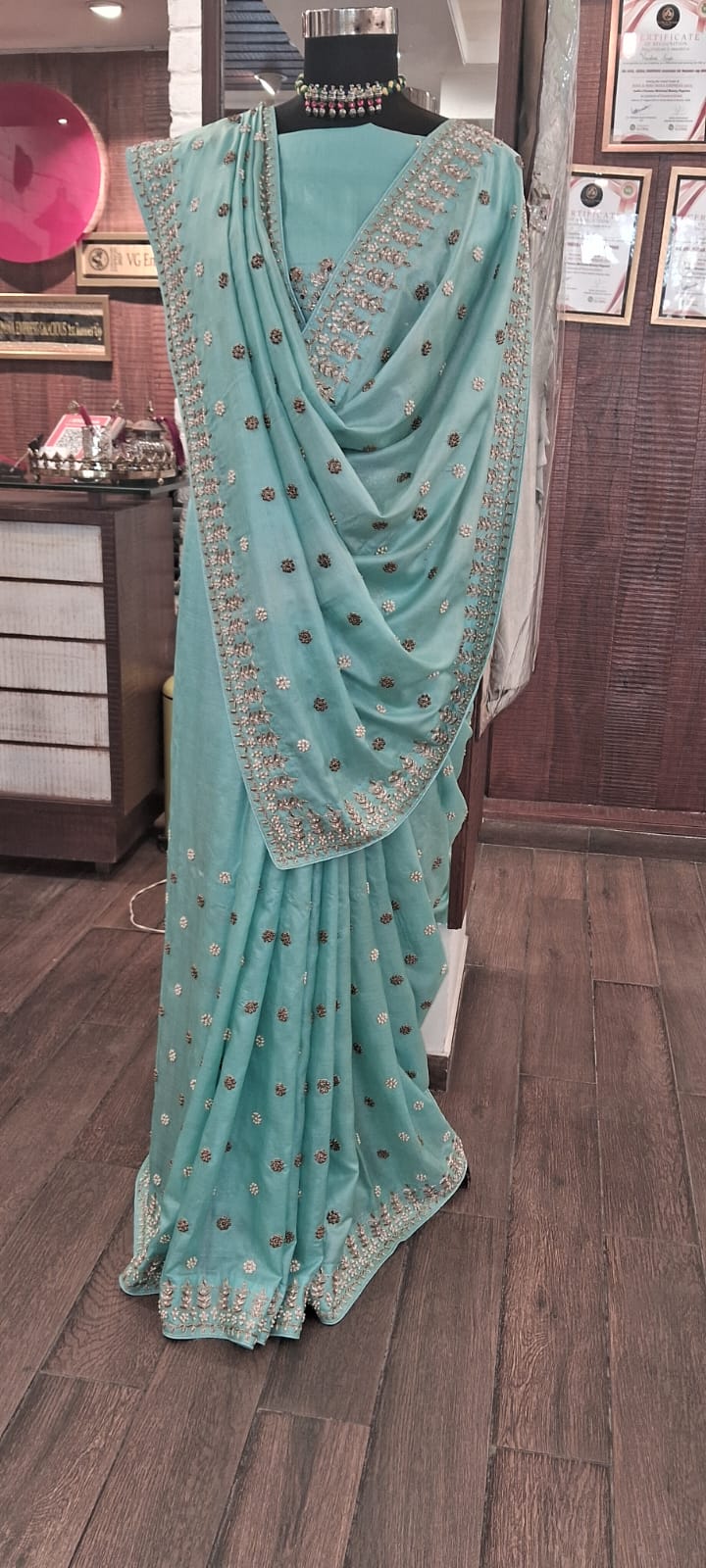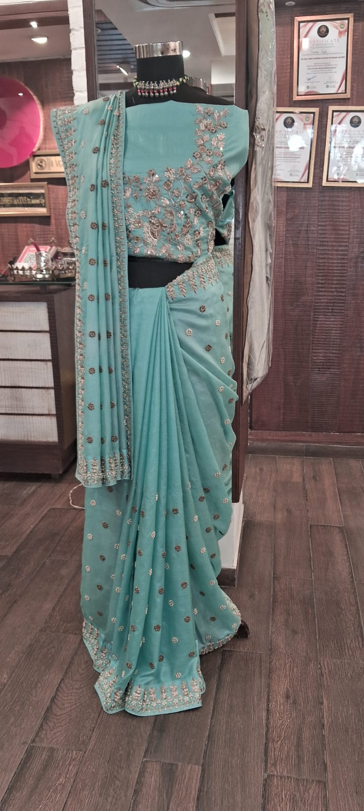 Product details – silk saree with zardozi and paul work Care instructions – dry cleaning only Know your Product – silk saree with full of zardozi and paul hand work (with zardozi work blouse fabric) Country origin – India Colour-tiffany