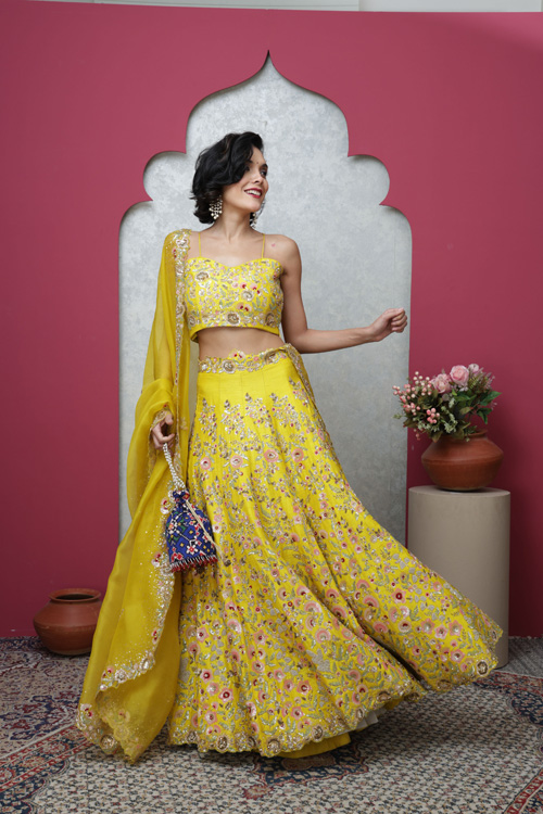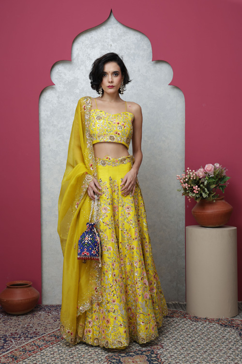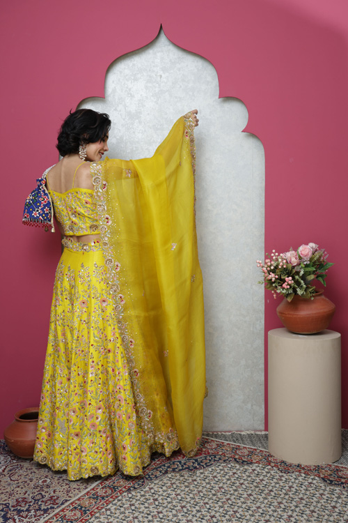Lehanga, unstitched choli and organza yellow dupatta. Hand embroidered work with zari and sequins